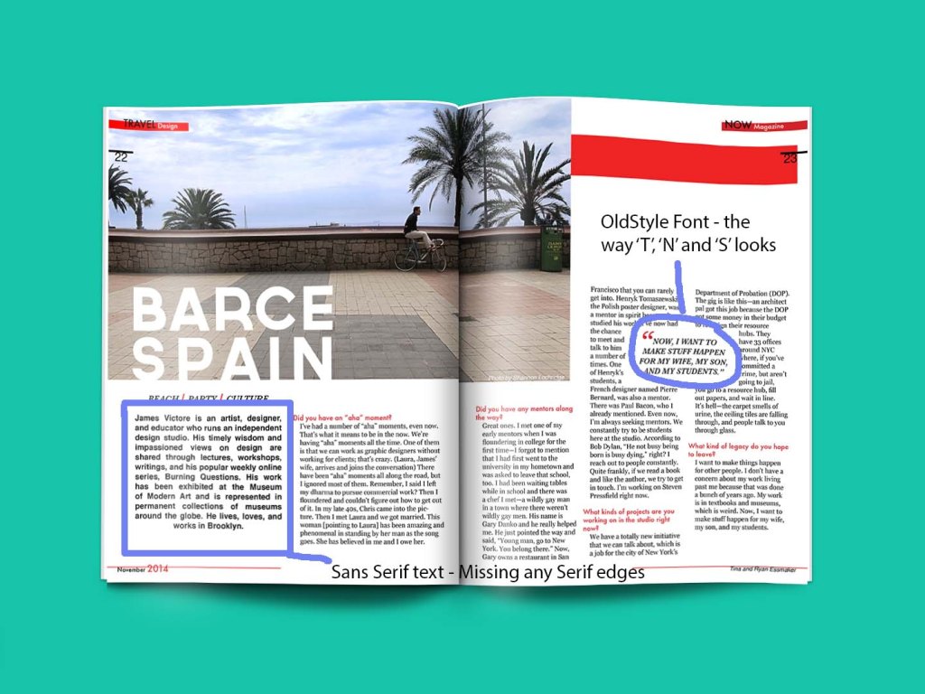 The principles used in this magazine spread help contribute to the overall design by making the photo appealing as well as giving a good spot for the title of the article. The different fonts separate the article into different items for the reader to read. The different font color adds title to each paragraph and shows where the new answer starts.