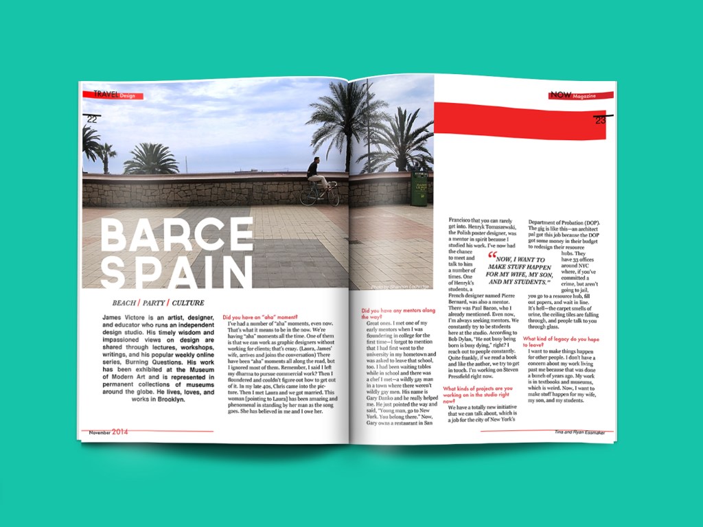 I found the image at https://stloch.com/barcelona-magazine-spread . I think the designers are Tina and Ryan Essmaker from NOW Magazine. It was published in November 2014.