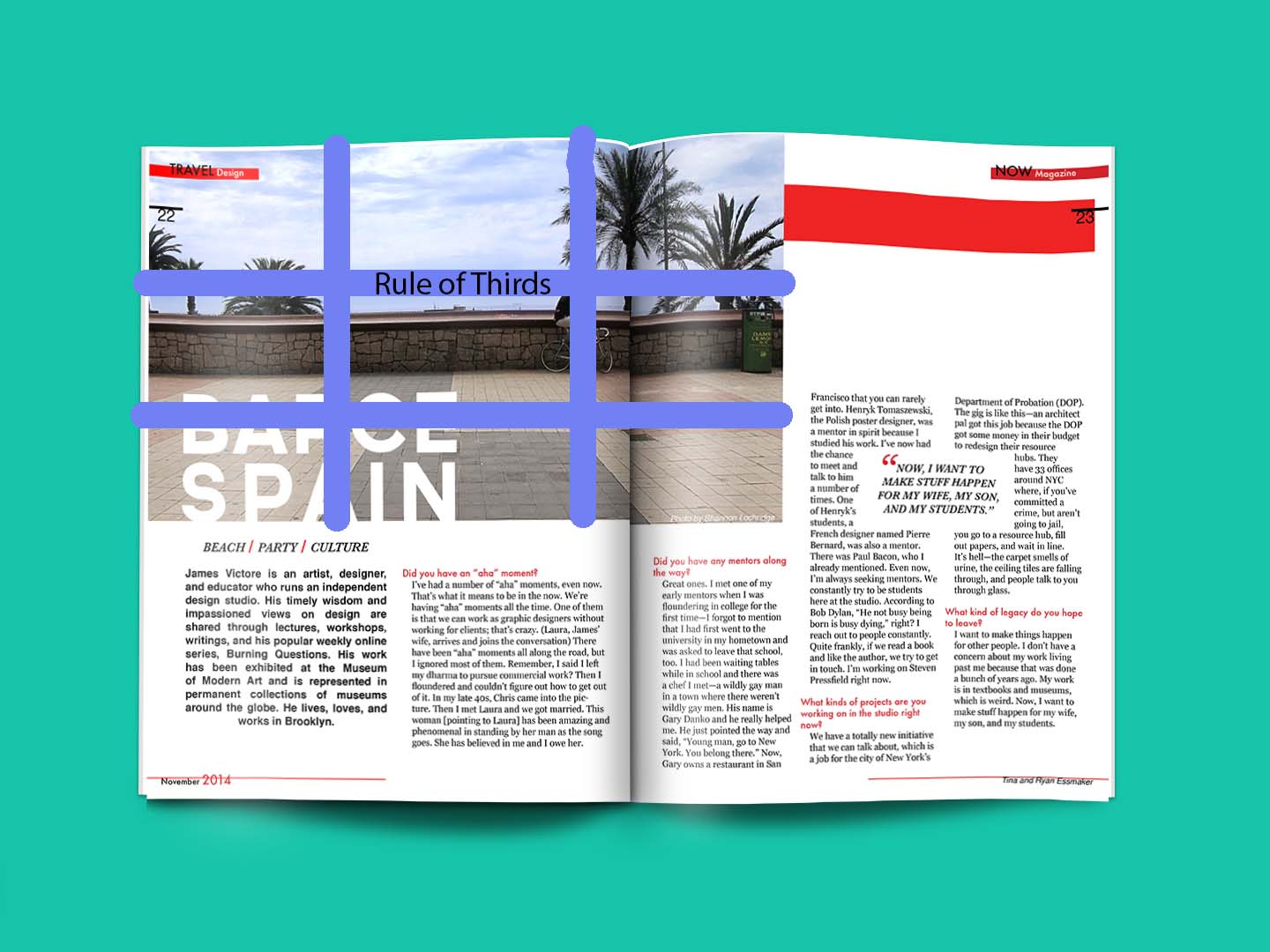 The photographer is following the rule of thirds by placing the object on the right hand side of the photo. The page designer also added text on the lower left side to help balance the photo and the photo is placed on the upper left side of the page to help break up the text below it.